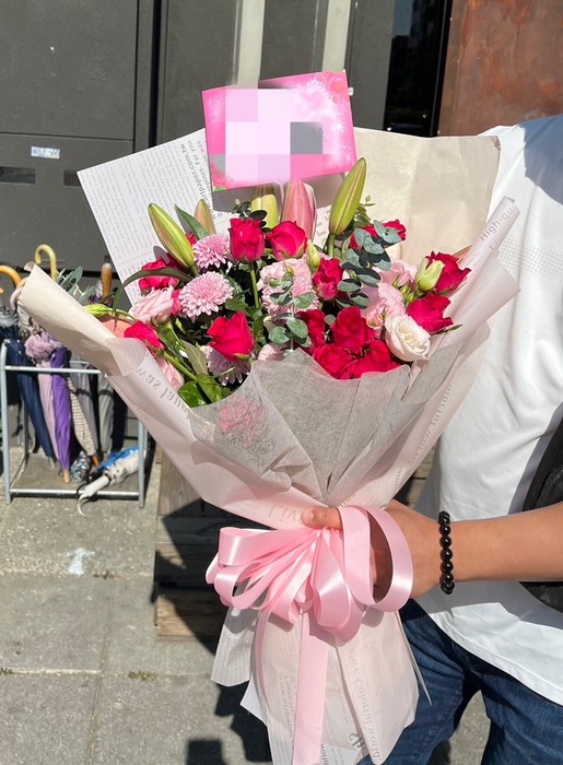 花材:玫瑰花.百合花.桔梗花.乒乓菊.尤加利